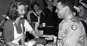 The goal? Food, dancing, entertainment, laughs, - offered up by some of the biggest stars in Hollywood. You might see Betty Grable washing dishes or Marlene Dietrich flipping burgers. Humphrey Bogart might serve you dinner. And the young soldiers danced the night away with beautiful stars they’d only seen before as figures on the silver screen.